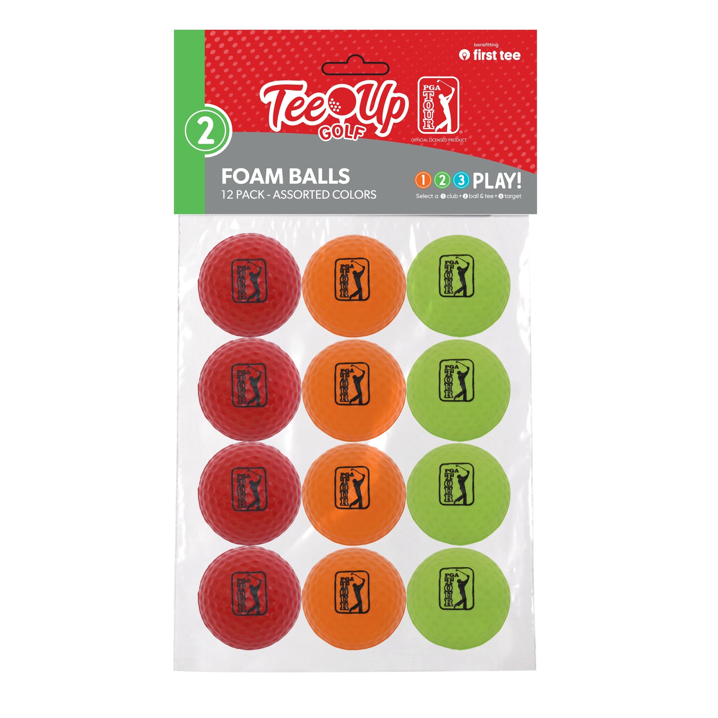 The high-quality PGA TOUR Tee-Up Foam Practice Golf Balls simulate a real ball flight at reduced distances and are safe to use indoors or out. Set includes 12 Multi-color foam balls, 1.68” Diameter, the same size as a real golf ball. Proceeds from every Golf Gen purchase benefit The First Tee, a nonprofit organization teaching kids and teens how to play golf.