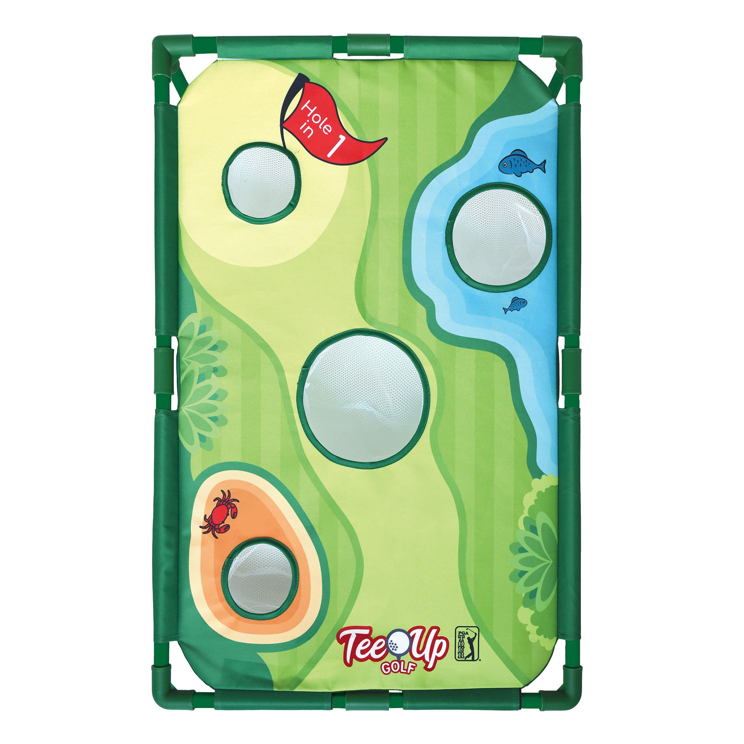 The PGA Tour Tee-Up Korn Hole Golf is an exciting game for everyone at any skill level. Sharpen your chipping skills or host a backyard golf tournament with family and friends. The set includes one 24" x 36" Target and Net, 12 Multi Color foam balls, and a Turf mat. You can sharpen your chipping skills or host a backyard golf tournament with family and friends. The Korn Hole Golf Game is compatible with all other Tee-Up products. Proceeds from every Golf Gen purchase immediately benefits The First Tee.